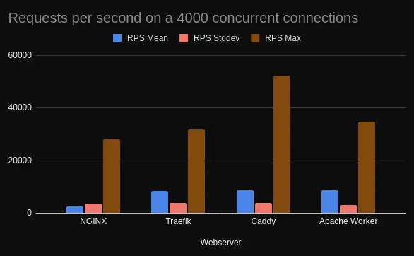 Traefik, Caddy and Apache lead the front with 8000rps each, and NGINX holds a mere 2000rps.